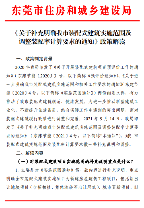 為進(jìn)一步推動(dòng)新型建筑工業(yè)化,不斷提升住建品質(zhì),9月14日,東莞市住建局發(fā)布《關(guān)于補(bǔ)充明確我市裝配式建筑實(shí)施范圍及調(diào)整裝配率計(jì)算要求的通知》。近日,東莞市住建局對(duì)該通知進(jìn)行政策解讀,提煉“三個(gè)重點(diǎn)”。