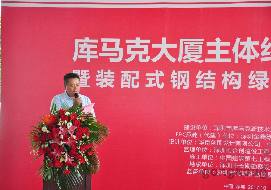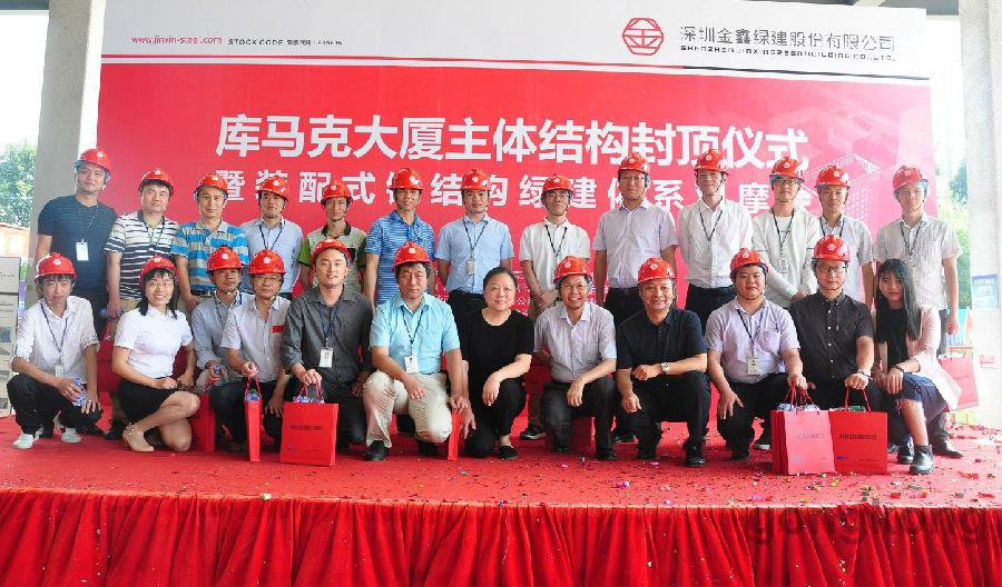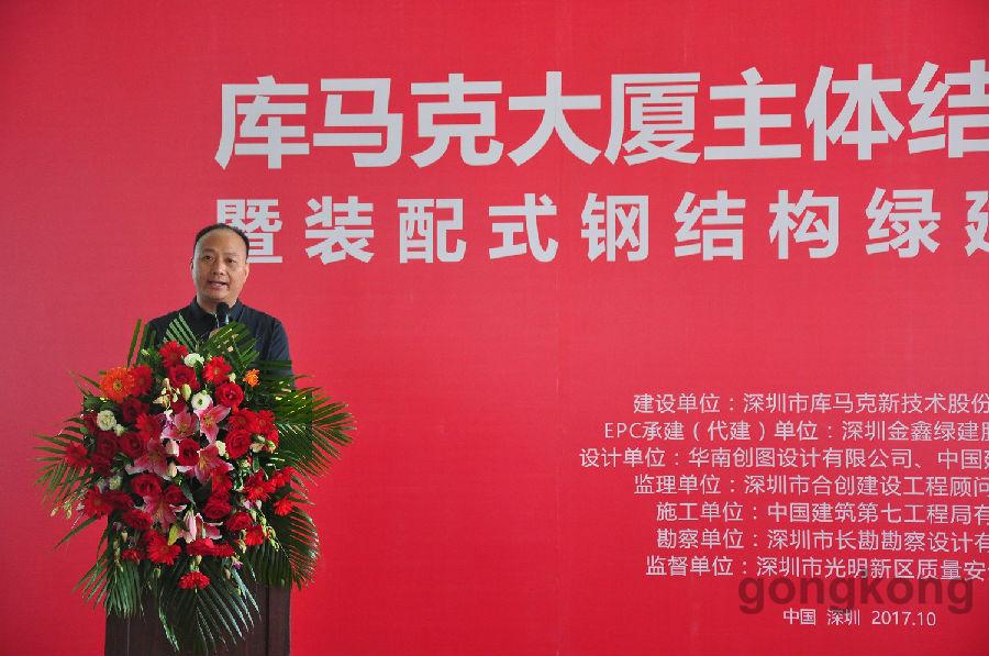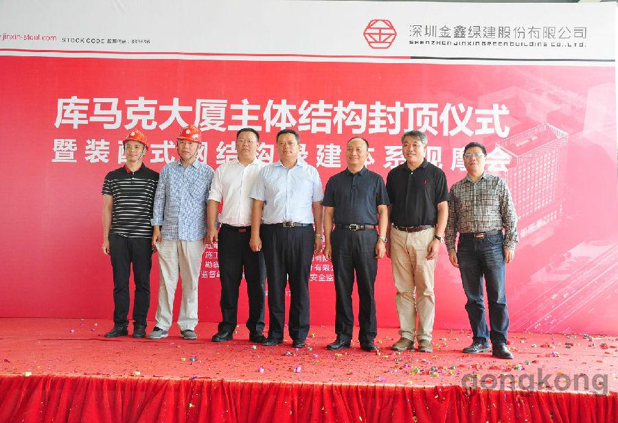 深圳市庫馬克新技術股份有限公司董事長李瑞常、深圳金鑫綠建股份有限公司董事長張楓、中國建筑第七工程局南方公司副總經理司翔、深圳市節能協會榮譽會長郝英吉、中國建筑科學研究院深圳分院總工程師劉建、深圳市合創建設工程顧問有限公司副總經理胡志毅出席封頂儀式并致辭致賀詞。庫馬克大廈建設項目,管理一流、資源節約、環境友好、建設過程節水、節材、無揚塵,庫馬克大廈按綠色三星標準建設。